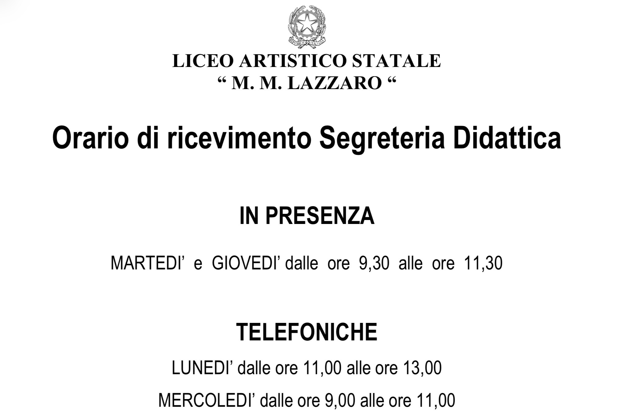 Orario di ricevimento: martedì e giovedì, dalle ore 9:00 alle ore 11.00